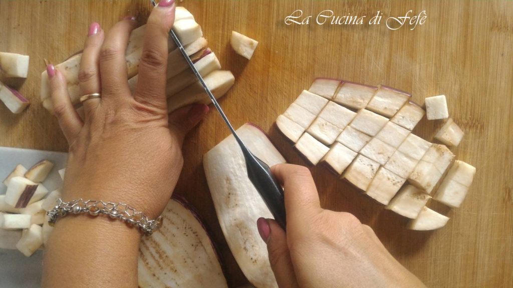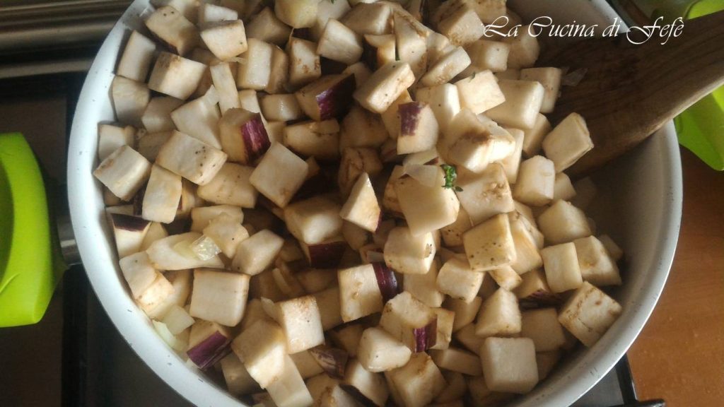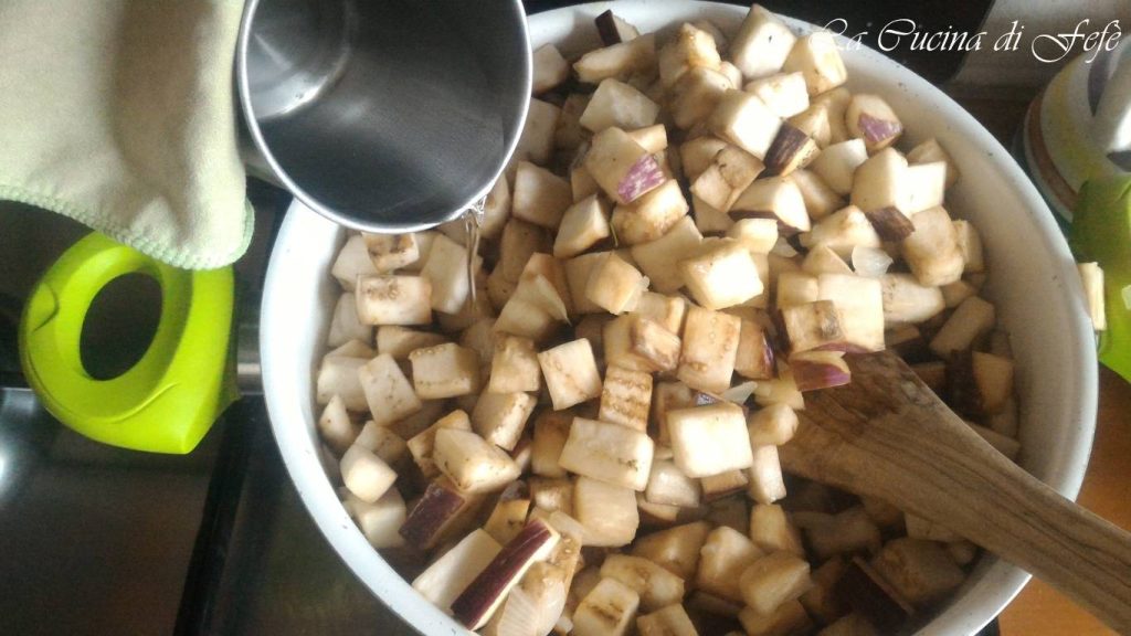 Añade los cubos de berenjena y deja que se sazone 2′ a fuego vivo.