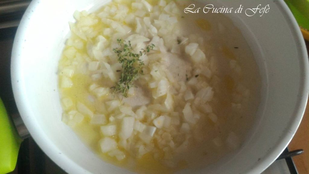 En una sartén grande, dora la cebolla con 3 cucharadas de aceite aromatizado con algunas ramitas de tomillo.