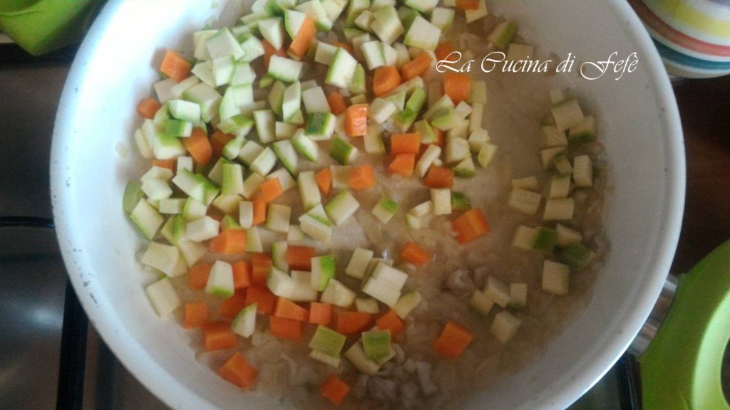 • Lava, limpia todas las verduras, córtalas y, con la ayuda de un cuchillo, córtalas en dados pequeños (brunoise) todos del mismo tamaño para facilitar una cocción uniforme. En una sartén antiadherente grande, dora el chalote con un buen chorro de aceite a fuego medio durante 2′, luego añade también los calabacines y las zanahorias.