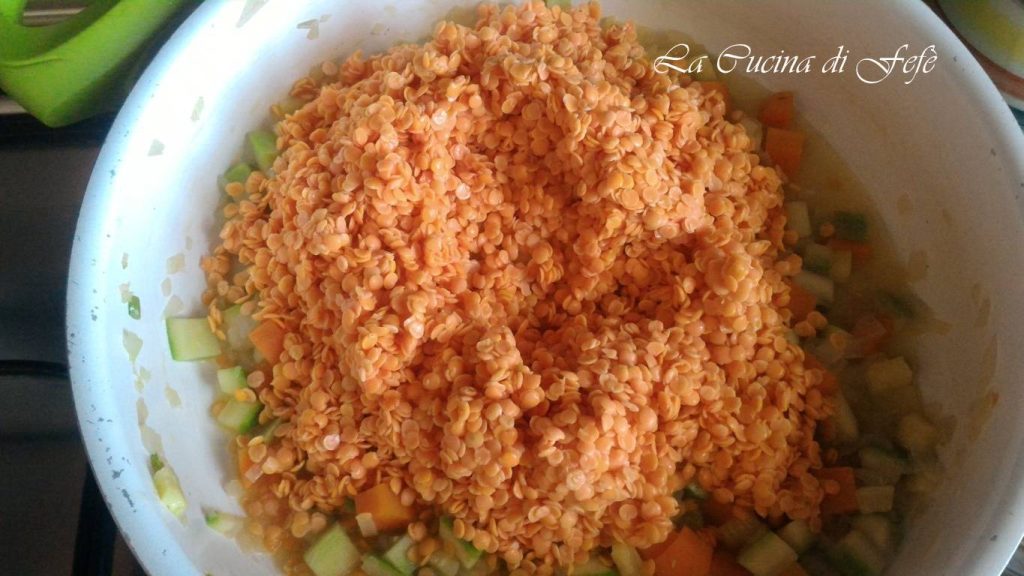 • Rocía con la mitad del agua caliente, deja cocer 5′ a fuego mínimo y añade las lentejas.