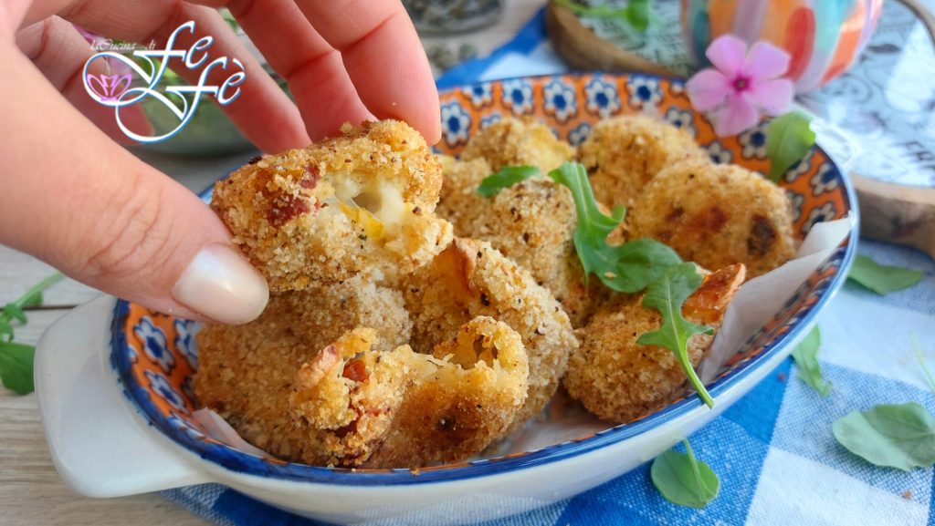 Transcurrido este tiempo, toma pequeñas porciones de masa, presiona bien entre las manos compactándola y coloca en el centro un cubito de scamorza.