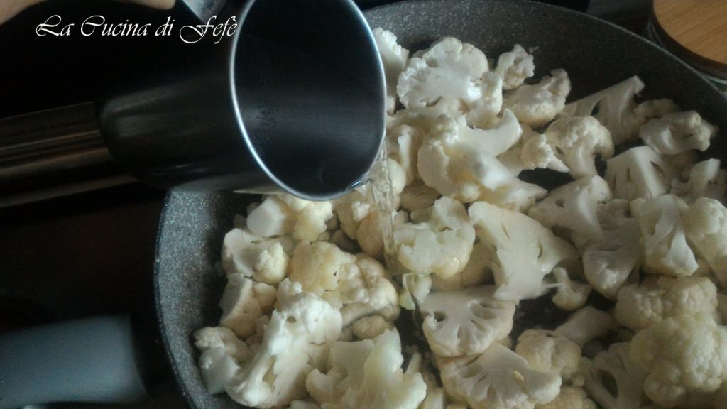 Cubre con 300 ml de agua caliente, cubre con una tapa y deja estofar durante aproximadamente 25′ o hasta que la coliflor esté tierna.