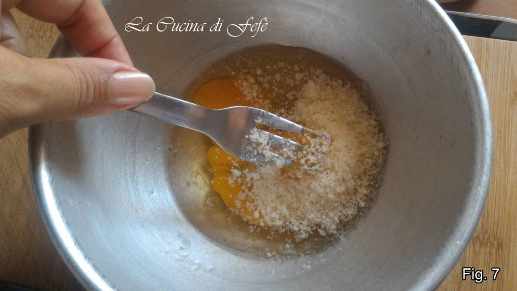 • En un segundo cuenco, con la ayuda de un tenedor, preparad un batido de huevos con el queso parmesano y un pizca de sal.