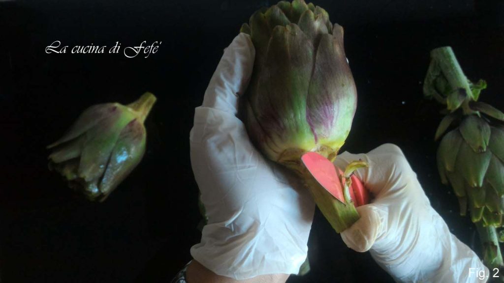 • Agrega algunos cubitos de caciocavallo o tuma siciliana en el corazón de la alcachofa y entre los pétalos más externos (fig. 2).