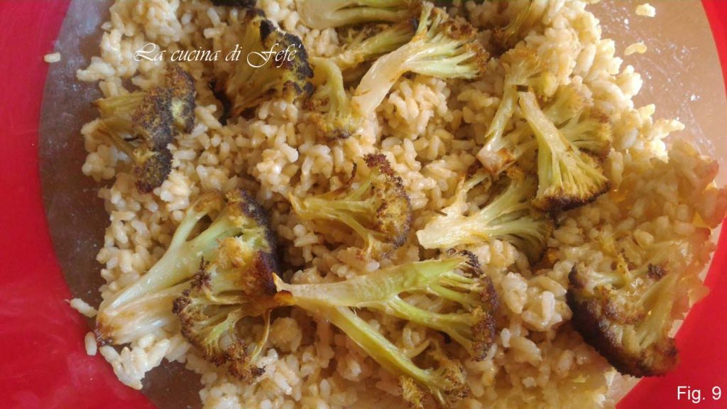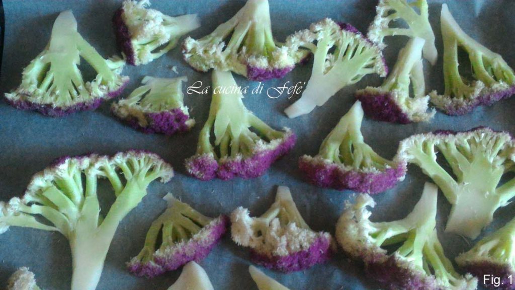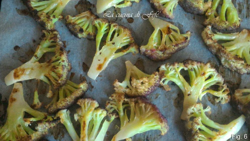 Pinta bien el coliflor con esta emulsión. Mete en el horno a 190°C durante 25′, luego dales la vuelta y deja cocer otros 5/8′ (fig. 5).