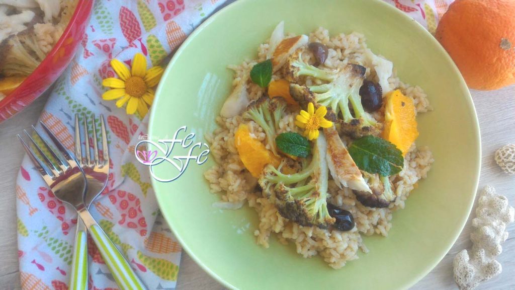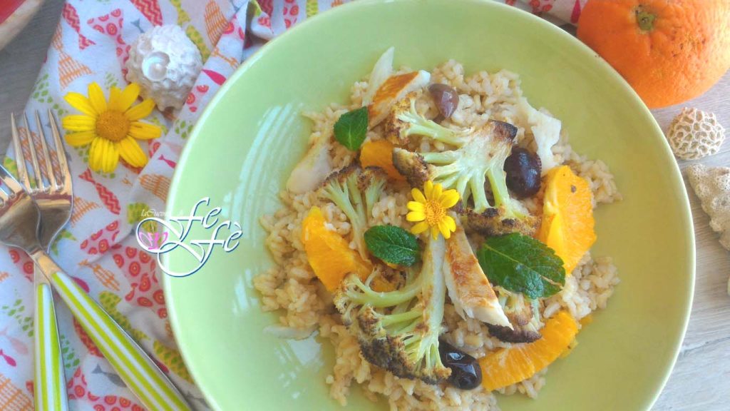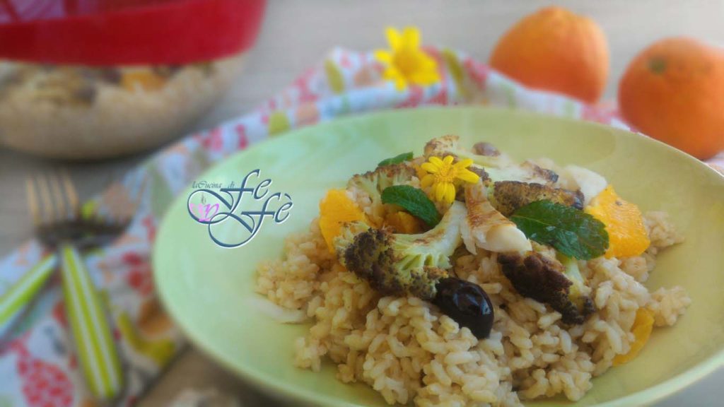 Cierro definitivamente la temporada de brócoli, coliflor y otras verduras puramente invernales con esta maravillosa receta, que sin embargo abre las puertas a un plato fresco y casi primaveral. Y después de las grandes comilonas pascuales, es importantísimo volver a la línea con grasas y calorías, ¡llevando a la mesa platos más equilibrados desde el punto de vista nutritivo! Hoy por eso os propongo un plato único sano y genuino, gracias a la elección del arroz integral, capaz de conservar todas sus propiedades nutricionales, al no haber sufrido el proceso de refinamiento y blanqueo típico del arroz clásico o de otros cereales. Además, no contiene ni gluten, ni lactosa, por lo que es especialmente adecuado para celiacos y para quienes no pueden consumir lácteos en general. En su interior encontramos los coliflores, alimentos antioxidantes y antiinflamatorios muy ricos en minerales y vitaminas. Otro dato no menos importante, es que también están indicados en caso de diabetes, ya que contribuyen, con su acción, al control de la glucemia. La adición de una nota cítrica, además de conferir al conjunto un sabor fresco y delicado, es fuente de bienestar para nuestro organismo, y en concreto para el corazón y la circulación. Las naranjas, de hecho, nos aportan muchas fibras y vitaminas, y son muy indicadas en una dieta hipocalórica. A esto se suman todas las cualidades de las carnes blancas del bacalao, pobres en grasas y ricas en Omega 3, conocidos por su capacidad de reducir el colesterol malo. En definitiva, ¡un verdadero elixir que todos deberíamos preparar para nuestra familia y consumir con más frecuencia!