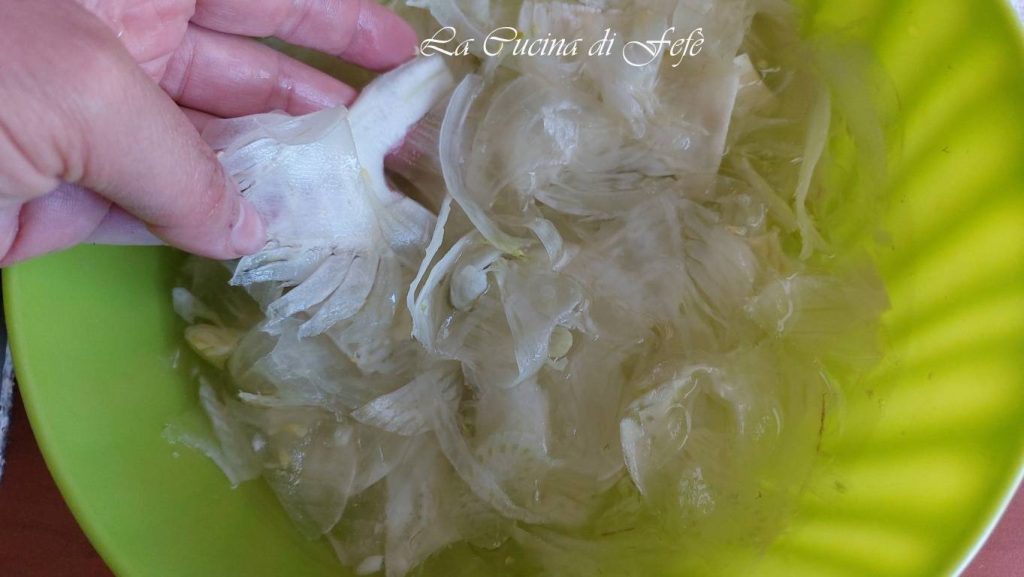 Sumergid las láminas en un bol con agua fría 10′. Quedarán crujientes y se rizarán ligeramente.