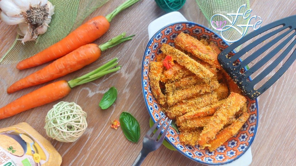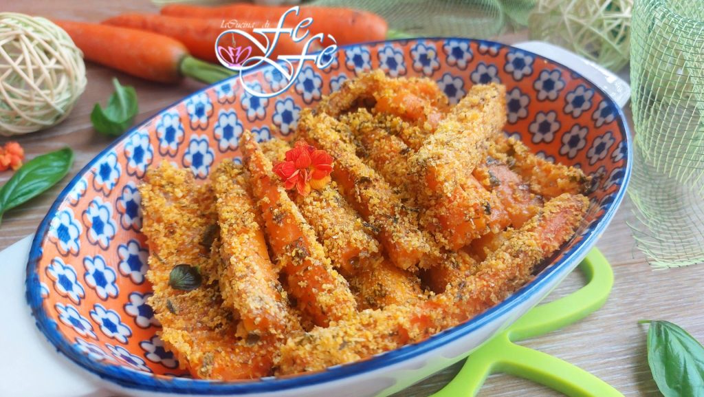 Siempre con el propósito de seguir las tendencias del verano, ¡hoy también quiero compartir con vosotros un plato muy sencillo, genuino e hipocalórico que, sin embargo, os sorprenderá en cuanto a sabor! Un acompañamiento vegetariano hecho con muy pocos ingredientes, todos fácilmente disponibles en vuestras despensas. Se trata de los bastoncillos de zanahoria empanados con queso, adecuados para toda la familia, incluso para los intolerantes al gluten, y perfectos especialmente cuando se desea algo ligero para mantenerse en forma. Además, se preparan en tiempo récord, solo hay que cortar las zanahorias en bastoncillos, condimentarlas rápidamente primero con unas cucharadas de aceite y luego pasarlas en una mezcla de hierbas aromáticas, especias, queso parmesano rallado y sémola de maíz o pan rallado si no tenéis la necesidad de llevar un acompañamiento sin gluten a la mesa. ¡En resumen, un plato comodín para todas las ocasiones!