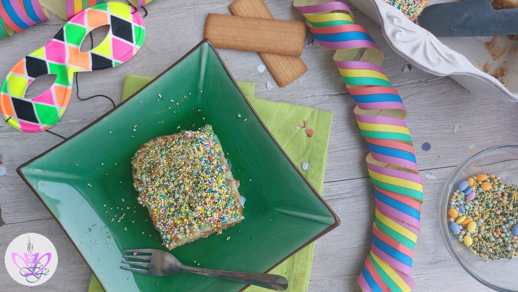 Transcurrido el tiempo de enfriamiento, solo te queda decorar la superficie con fideítos de colores o azúcar decorativa que no solo se derretirán con el calor de la crema, sino que también le darán un aspecto festivo a tu postre. Vuelve a poner el postre en el frigorífico por lo menos 3-4 h antes de servir. Una vez bien cuajado será también más fácil de cortar.