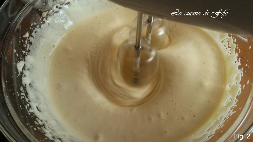 Aparte, en un bol, con las batidoras eléctricas o un robot de cocina, montad los huevos a temperatura ambiente con el azúcar durante 6′ hasta que estén claros y esponjosos.