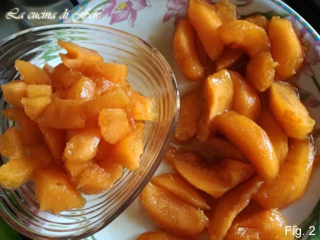 Comienza lavando los albaricoques, luego pélalos y quítales el hueso interno. Corta los primeros dos en rodajas y espolvorea con azúcar de caña integral (fig. 1).