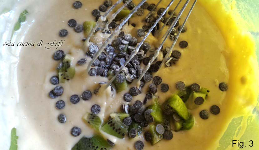 Añade ahora los trozos de kiwi a la mezcla junto con las gotas de chocolate ligeramente enharinadas para evitar que se hundan durante la cocción, sin mezclarlos demasiado (fig. 3).