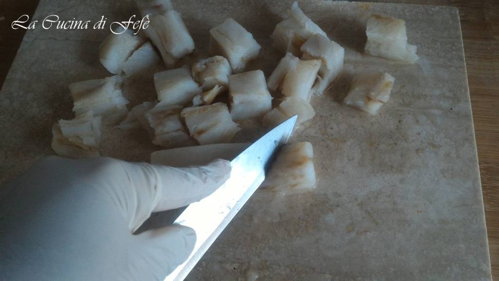 Primero, la noche anterior, pasad los filetes de merluza del congelador al frigorífico, para obtener la descongelación correcta y evitar la proliferación de bacterias. Al día siguiente, en una tabla de cortar, cortad los filetes ya blandos en cubos de aproximadamente 1,5 cm.