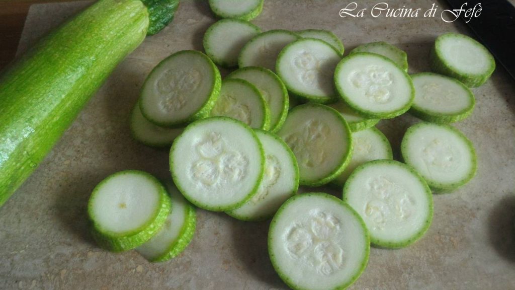 Mientras tanto, lavad y cortad los calabacines y reducidlos a rodajas de 1 cm de grosor.