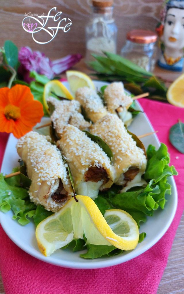Las brochetas de pollo con radicchio, laurel y sésamo fueron una de mis primeras recetas, cuando tenía el antiguo blog que encontré entre los archivos con fotos realmente escandalosas. Desde entonces, he cuidado cada vez más no solo la estética de mis platos sino también la forma de presentarlos. Entonces, habiendo comprado unas lonchas de pollo de corral esta mañana en mi carnicero de confianza, me convencí de que estas brochetas debían formar parte del nuevo blog. De hecho, son un segundo plato realmente sabroso y rapidísimo de preparar, porque el relleno está completamente en crudo, así que no perderás mucho tiempo en la cocina. El radicchio le da a la carne, de por sí delicada, un ligero retrogusto amargo que crea un equilibrio perfecto de sabores, mientras que el empanado con semillas de sésamo dará al paladar una nota tostada y crujiente al mismo tiempo. Sin contar sus beneficios, especialmente el hecho de que son consideradas entre las principales fuentes vegetales de calcio, lo que, como he dicho varias veces, es realmente útil para fortalecer los huesos y los dientes. Al final de la cocción, habrán liberado un jugo aromático realmente sabroso que puedes recoger con una cuchara y usar para rociar tus brochetas antes de servirlas. Pruébalas, porque serán muy apreciadas por todos, incluso por los más reacios a la vista del pollo, y ¡se acabarán en un instante!