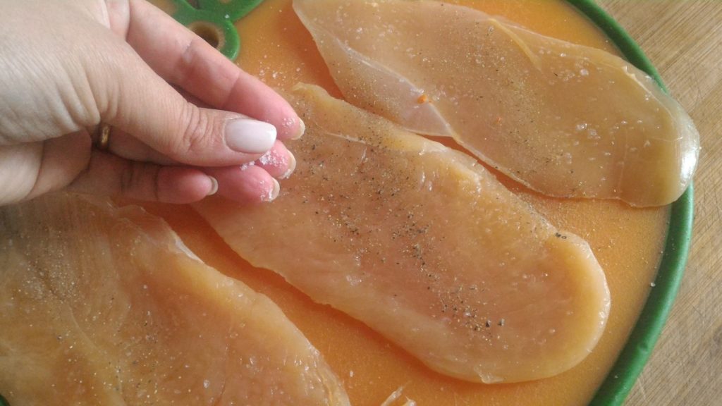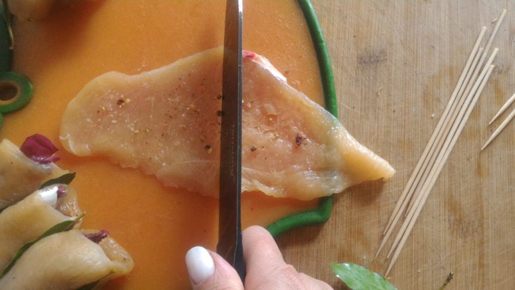 Sobre una tabla de cortar, golpea las lonchas de pollo con un mazo de cocina, para extenderlas y aplanarlas.