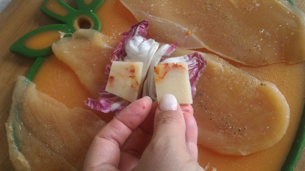 Coloca sobre cada loncha de pollo algunas tiras de radicchio previamente lavado y escurrido, y cubos de provola.