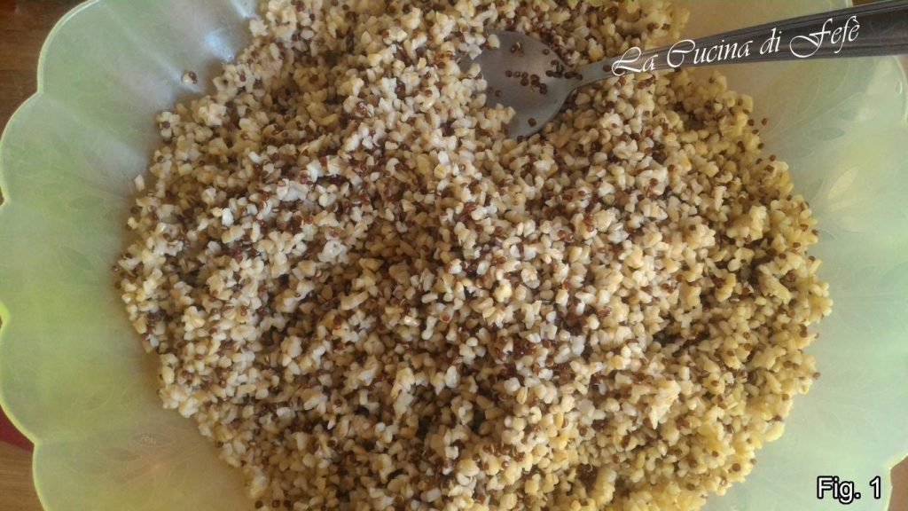 • Dentro de una sartén amplia, cubrid el bulgur, la quinoa y los cereales completamente con caldo de verduras o agua caliente ligeramente salada y tapad con una tapa*. Dejad reposar 15′, luego, desgranad con las púas de un tenedor como si fuera cuscús, pasad vuestra base a una ensaladera y dejad enfriar condimentando con 2 cucharadas de aceite (fig. 1).