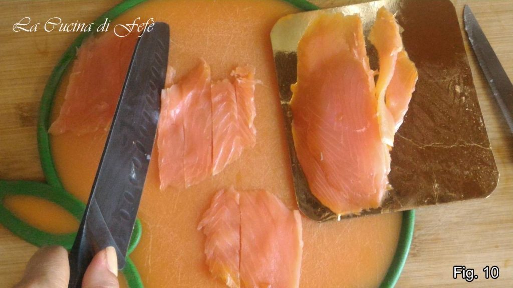 • Cortad el salmón ahumado en tiras y añadidlas a vuestra ensalada (fig. 10). Completad con un puñado de rúcula y condimentad con el resto del aceite (fig. 11).