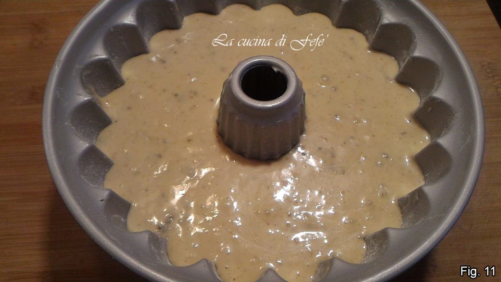 • Transfiere la mezcla a un molde de bundtcake o de pastel previamente enmantecado y enharinado y nivela (fig. 11).