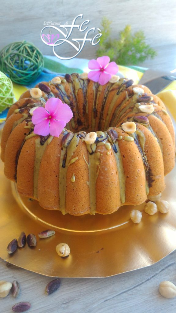 Con motivo del segundo encuentro del mes para la sección Il Granaio, aquí estoy con un dulce rico en frutos secos y, en particular, a base de avellanas y pistachos de Bronte. ¡Una bundtcake preparada para una queridísima amiga intolerante al gluten, por lo que solo con ingredientes que están totalmente libres de él! La idea era combinar lo útil y lo placentero, preparando un dulce que la emocionara y contribuyendo a la riqueza del pan junto con mis otras colegas. ¡Quería conferir un sabor extremadamente avellanado a este dulce, y diría que lo he logrado ampliamente! De hecho, las avellanas se reducen casi a harina y se añaden a la masa junto con el almidón de maíz y la harina de arroz. Además, para darle un sabor aún más pronunciado, elegí perfumarla aún más añadiendo yogur y leche de avellana. Por supuesto, dado que la bundtcake por su definición rara vez se sirve solo con azúcar glas, elegí decorarla con crema de avellanas y pistachos. De hecho, la particularidad de este pastel está en su forma, hoy más que en el pasado, gracias a las ranuras de todo tipo capaces de alojar cualquier glaseado de cobertura. Un último comentario que considero necesario, para preparar este dulce no es necesario este tipo de molde, también puedes hacerlo en uno simple de rosquilla, pero no será lo mismo, porque la estética es parte de su significado. ¡Piénsalo!