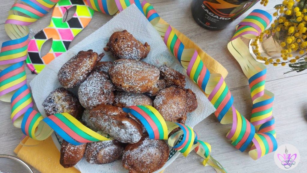 Por supuesto, el sabor cítrico del licor Zagaro se puede sustituir tranquilamente por la misma cantidad de zumo de naranja colado, o zumo de manzana o sidra de manzana, o alternativamente zumo de albaricoque o de melocotón diluido con agua. En caso de que necesites preparar los buñuelos para invitados adultos, te recomiendo el licor Strega, el Maraschino o el licor de anís.
