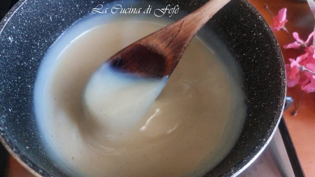 Luego completa vertiendo también la leche con el almidón de maíz disuelto con el azúcar.