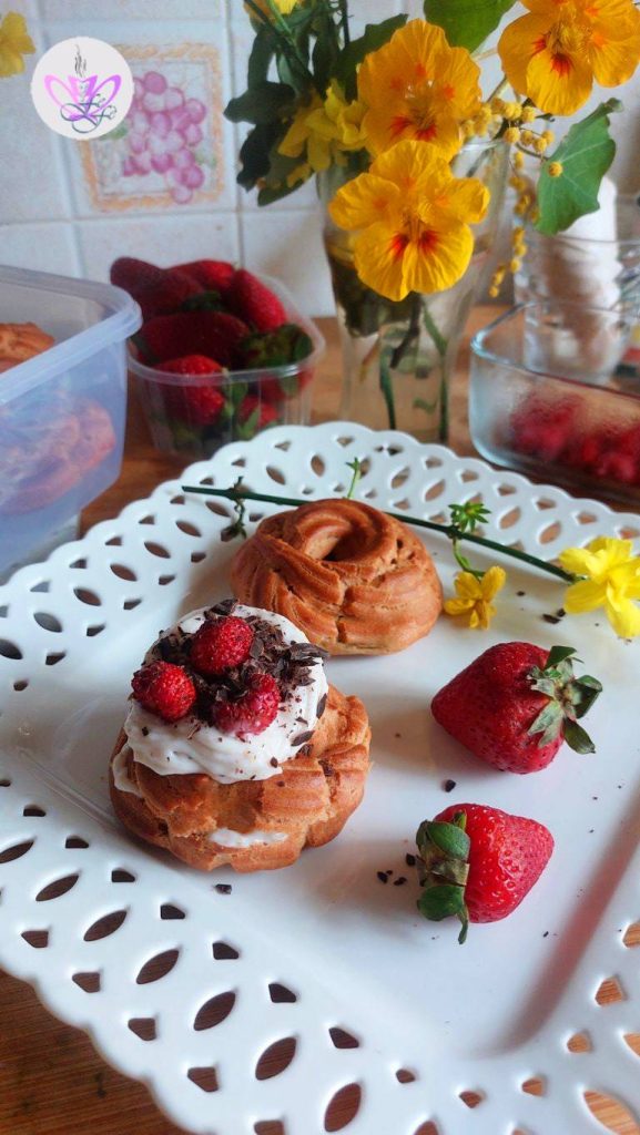Y voilà… ¡los buñuelos dulces con crema veg de vainilla y fresitas del bosque están listos para ser disfrutados!