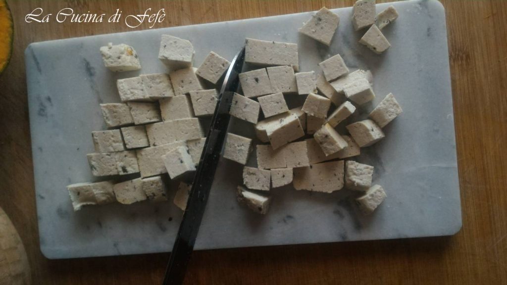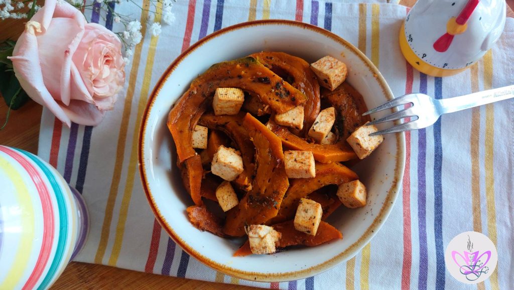 La calabaza es una de mis verduras otoñales favoritas, no solo por su sabor intenso sino también por su versatilidad. Permite combinarla con varios ingredientes que se complementan perfectamente, entre ellos el tofu, un alimento vegano, también conocido como queso vegetal, bajo en calorías a base de semillas de soja. Sin embargo, el tofu, debido a su sabor muy neutro, es poco apreciado o subestimado, pero si se condimenta y cocina de cierta forma, puede ofrecer muchas satisfacciones al paladar, como en esta receta donde la combinación con la calabaza, en mi opinión, es realmente sorprendente. Sin mencionar las múltiples propiedades nutricionales que este alimento ofrece al organismo con efectos beneficiosos para la salud. El tofu presenta de hecho una cantidad decente de proteínas, lo que permite usarlo frecuentemente en sustitución de fuentes proteicas de origen animal como carne y pescado. En esta receta se pone primero a marinar, cuanto más tiempo lo dejes, más sabroso será, por lo que te recomiendo al menos veinte minutos. La marinación a base de aceite, zumo de limón, salsa de soja y pimentón, aporta un sabor final más audaz y decidido, y es este paso previo en la cocina el que decreta su éxito. Será el perfecto plato principal o guarnición rica, para quienes sigan una alimentación vegana o simplemente para quienes deseen consumir una comida más ligera y sencilla, ¡sin renunciar al sabor!