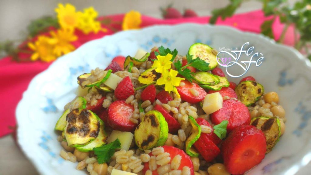 La ensalada de cebada perlada con garbanzos, calabacines y fresas nació un poco por casualidad, como muchas de mis recetas anti-desperdicio y de reciclaje. La regla básica es no comprar en exceso para evitar que los alimentos caduquen sin haber tenido tiempo de consumirlos. Si esto ocurriera, atraídos por precios competitivos y convenientes, simplemente recicla el exceso y utilízalo en otras recetas. ¡Y este es el caso! Una caja de fresas súper conveniente que corría el riesgo de no ser consumida a tiempo. No quería hacer el típico postre de fresas, más bien me intrigaba la idea de preparar un primer plato vegetariano de estilo primaveral, fresco y delicado, pero sobre todo rico en proteínas, vitaminas y sales minerales. Las fresas ofrecen un placer al paladar realmente único, ligeramente suavizado por el sabor más fuerte del queso ahumado del Casale, una especialidad láctea siciliana de los montes Nebrodi, que podéis sustituir con un queso ahumado dulce o picante a vuestra elección. En resumen, un plato inusual con un sabor sorprendente que, prometo, no os decepcionará.