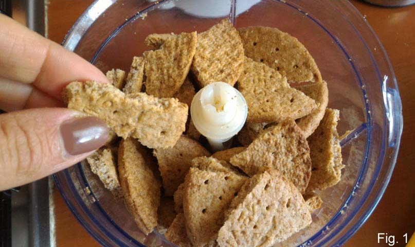 Comenzad preparando la base, triturando las galletas finamente. Ponedlas en una bolsa para alimentos, cerradla y comenzad a triturarlas pasándolas con un rodillo. O bien, para acelerar el proceso, trituradlas como hice yo dentro de un procesador de alimentos.