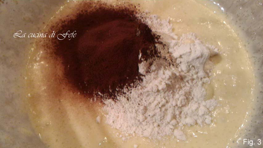 En dos cuencos separad las yemas de las claras. Batid las claras a punto de nieve y reservadlas. Trabajad las yemas junto con el azúcar, luego añadid el cacao y la harina tamizados.