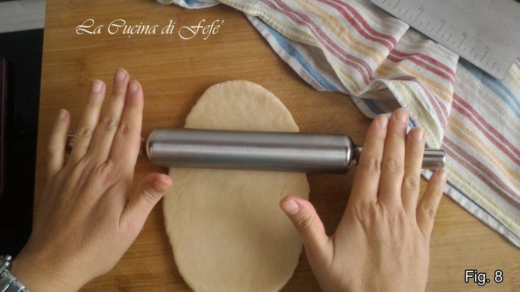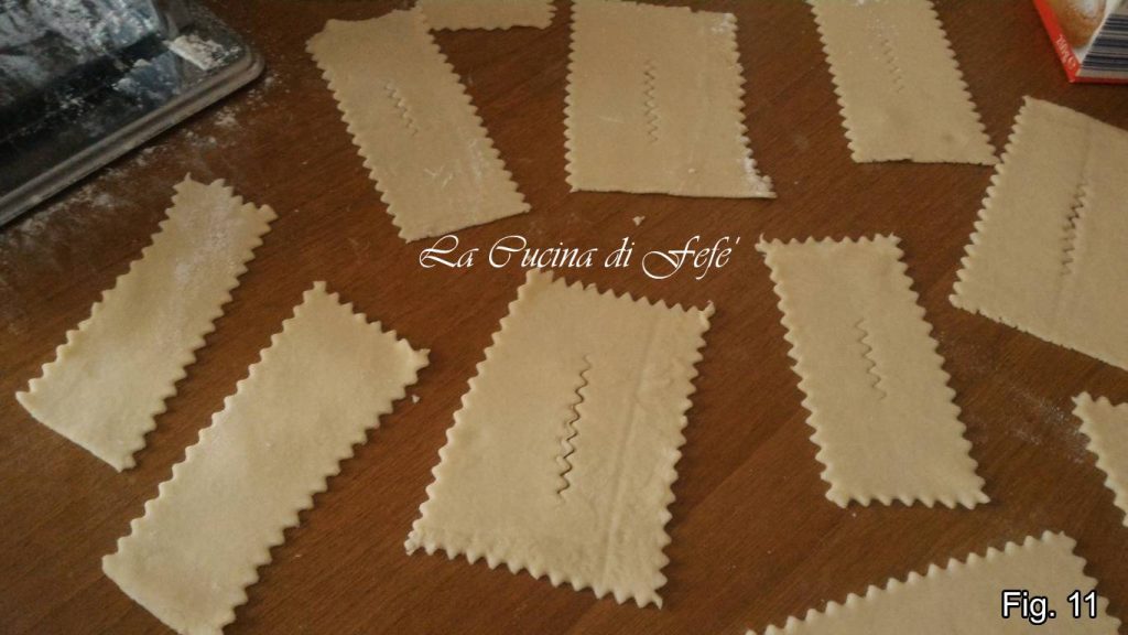 • Con un cortapastas dentado, corta rectángulos de aproximadamente 5×10 cm y haz en cada uno de ellos un corte central.