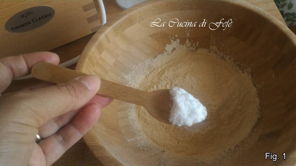 • Comienza tamizando en un cuenco la harina de lentejas. Si no la encuentras, podrás hacerla en casa siguiendo los pasos de la receta AQUÍ. Luego, añade la sal y mezcla con un batidor de mano (fig. 1).