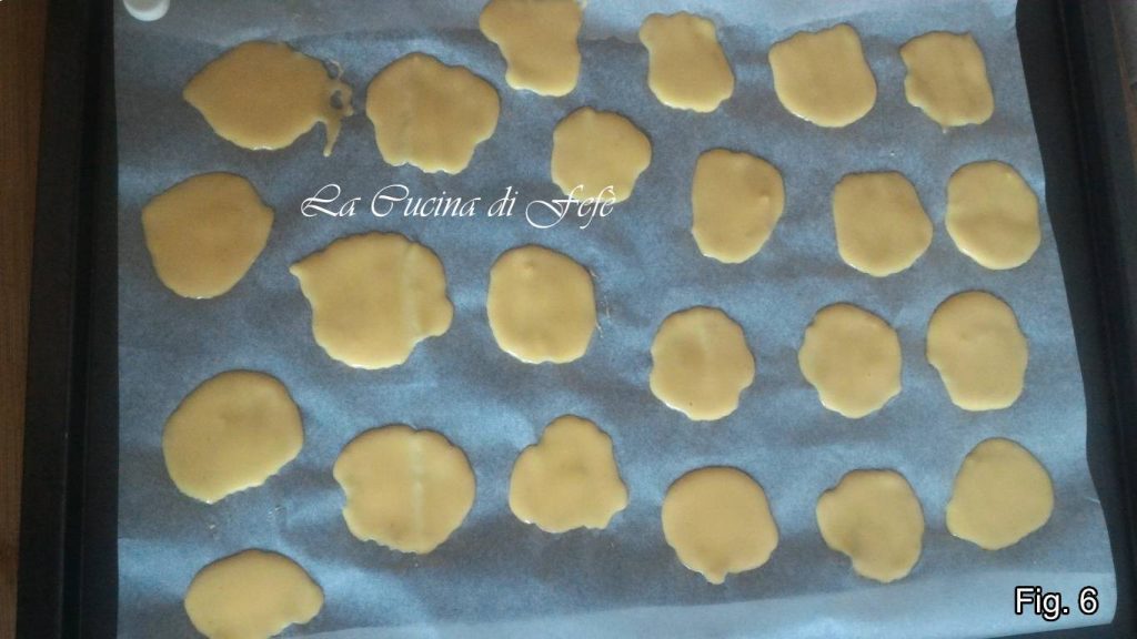 • En este punto distribuye poco menos de 1/2 cucharada de masa a la vez en una bandeja forrada con papel de horno, formando discos muy finos. Cuanto más finos sean, más crujientes y similares a papas fritas estarán al final de la cocción (fig. 5).