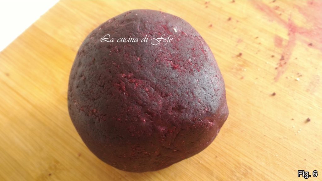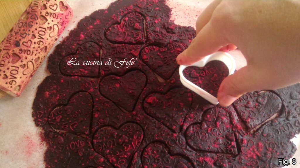 Extiende la otra mitad entre dos hojas de papel de horno con la ayuda de un rodillo. Yo luego espolvoreé con harina de remolacha y pasé la superficie con un rodillo decorativo, paso absolutamente opcional. Luego saca tus galletas con un molde de corazón.