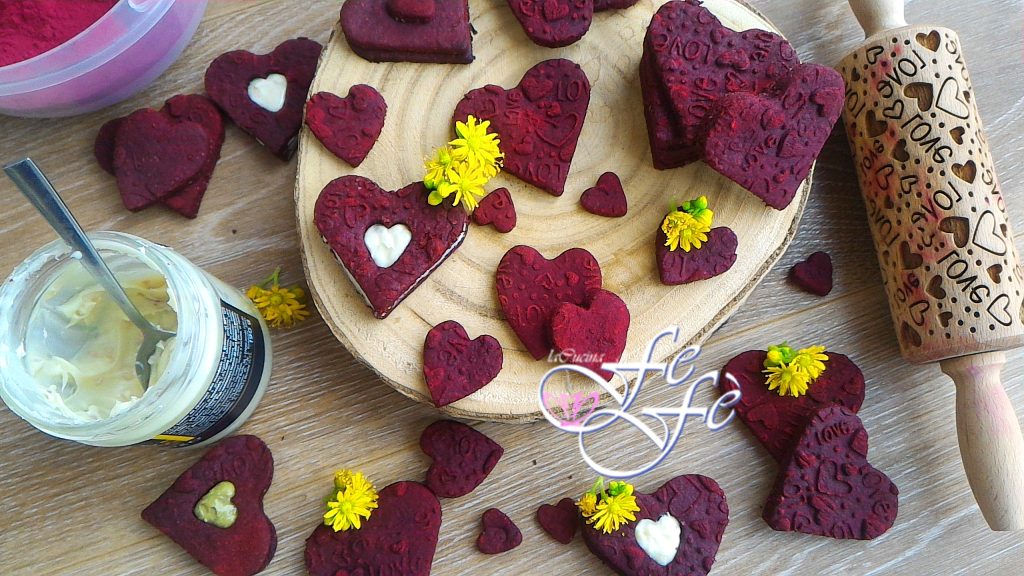 Pues sí, este año me dejé tentar para preparar unas galletas temáticas para la fiesta más comercial que hay. No soy amante de los gadgets de San Valentín, ni de todas esas frases melosas que se dicen en esta ocasión, pero si debo sacar algo positivo de esta fiesta, es el significado más amplio de la palabra Amor! Y entonces esta fiesta para mí significa amor hacia un padre, un hijo, un compañero, una hermana, una amiga, hacia el prójimo! Este es mi San Valentín, y con este espíritu, yo también he preparado muchos corazones de galleta realmente especiales, rojos como la harina de remolacha utilizada y dulces como la de almendras. ¡Un perfecto abrazo de sabores y aromas inimaginables! Y lo mejor es que también son sin gluten. La harina de remolacha desafortunadamente no es un ingrediente que se pueda encontrar en el mercado, yo de hecho la compré en internet, pero realmente vale la pena, porque la fragancia que desprenderá es algo absolutamente único! Además, teniéndola en la despensa, quise aprovecharla para jugar con el efecto cromático. ¿Qué decís, lo he logrado? Escríbeme qué opinas. ¡Y buen amor para todos!!!