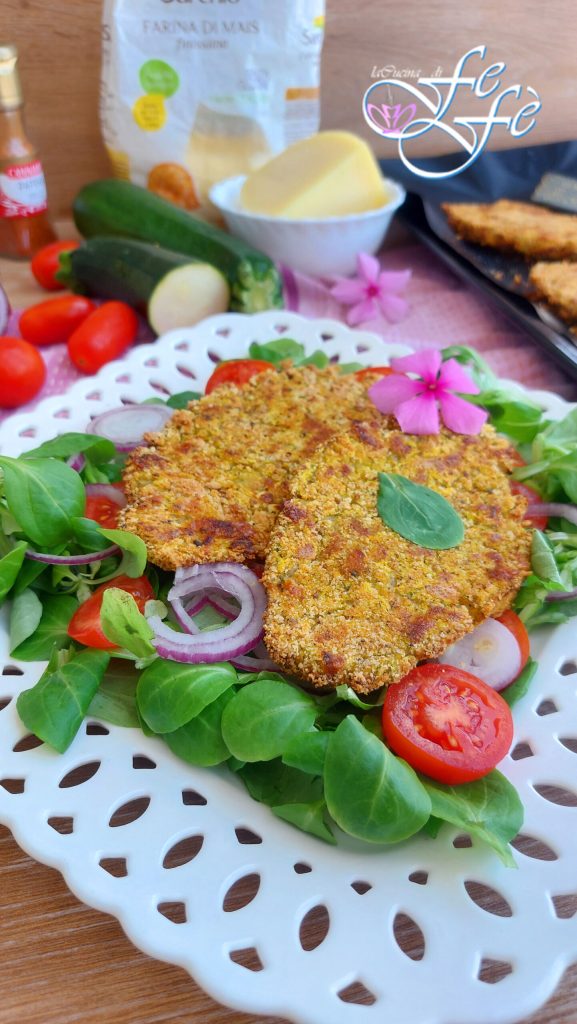 Como todos vosotros ya sabéis, siendo buena siciliana, me gusta empanar un poco de todo, ¡es nuestro ADN el que nos lo pide y al que no se puede decir que no! Últimamente, sin embargo, he descubierto también el amor por los empanados. ¡Sí, me gusta empanar las cosas más variadas! Ayer os di una pequeña muestra creando las míticas cotoletas de tomates que en las redes sociales, dejaron huella. Hoy, por lo tanto, utilizo los calabacines para aplicar el mismo concepto básico, creando una variante vegetariana de la receta clásica de las cotoletas de carne con una masa de calabacines rallados y provola silana traída por mi mamá directamente desde Calabria. Además, son cotoletas especiales, porque a diferencia del tradicional paso en un batido de huevos, ¡estas no tienen ninguno! ¡Y aun así nos hemos chupado los dedos! ¡Crujientes por fuera y suaves y fundentes por dentro! También en este caso, como con las cotoletas de tomates, podéis llevarlas a la mesa acompañadas de una ensalada fresca, al igual que yo lo hice, o proponerlas en un buffet informal dándoles una forma de medallón en lugar de alargada y un poco más pequeña. ¡Seréis un éxito total!