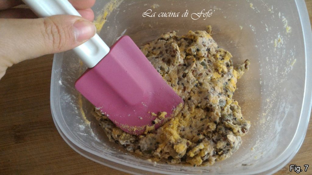 Finalmente añade la harina de maíz. Mezcla hasta amalgamar todos los ingredientes. Si la masa todavía está demasiado blanda, añade más harina de maíz poco a poco (fig. 6).