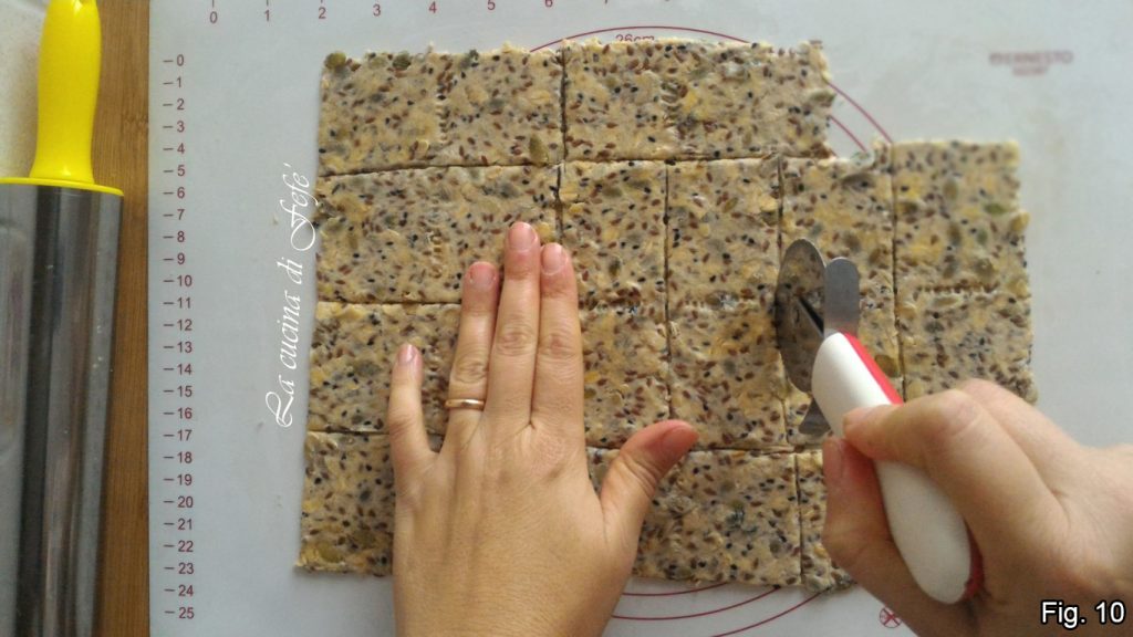 Corta tus crackers haciendo con la rueda siempre de hoja lisa tres cortes horizontales y dos verticales o según tu gusto (fig. 10).