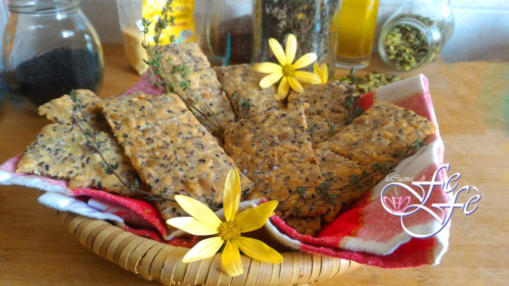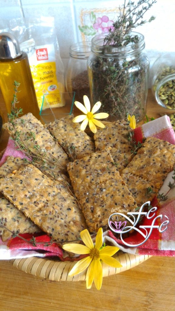 ¡La receta que os propongo hoy fue realizada durante una de mis transmisiones en vivo en las redes sociales! Se prepara tan rápidamente que creeréis que la haréis mil veces más. Se trata de deliciosos crackers cuya masa se trabaja toda en un bol con una cuchara de madera, sin la molestia de ensuciarnos las manos. Luego se transferirá directamente a la bandeja y se extenderá sobre dos hojas de papel de horno. ¡Nada más práctico! ¡Pero hay más! Estos crackers están hechos de semillas oleaginosas, naturalmente ricos en omega-3 y omega-6, es decir, grasas esenciales que ayudan a reducir los niveles de colesterol malo y contribuyen a protegernos de la arteriosclerosis. Además, son buenísimos y confieren a la masa, una vez cocida, un sabor tostado realmente único. Además, la harina de maíz fioretto, elegida especialmente para combinar armoniosamente con ellos, otorgará a estos crackers una crocanteza perfecta a prueba del tiempo. Finalmente, para un toque de salinidad, he añadido una nota aromática adicional con tomillo fresco y he añadido escamas de sal en la superficie antes de hornearlos. ¡Una combinación fantástica, tanto que hoy mi marido, algo curioso, robó uno para probarlo y se fue, para luego volver al lugar del crimen pocos momentos después y darse un festín desvergonzadamente frente a mis ojos! En realidad, estos crackers son adictivos, pero cuidado, si bien es cierto que las semillas son un ingrediente saludable para nuestro organismo, no se puede decir lo mismo de nuestra línea. Así que por favor, disfrútalos, pero con moderación. Podrás llevarlos contigo al trabajo como tentempié o como merienda saludable para picar a media tarde. Agregados a la mesa junto a la cesta del pan o para enriquecerla aún más, serán el no va más. En resumen, pruébalos, porque estoy convencida de que te enamorarás al primer bocado.