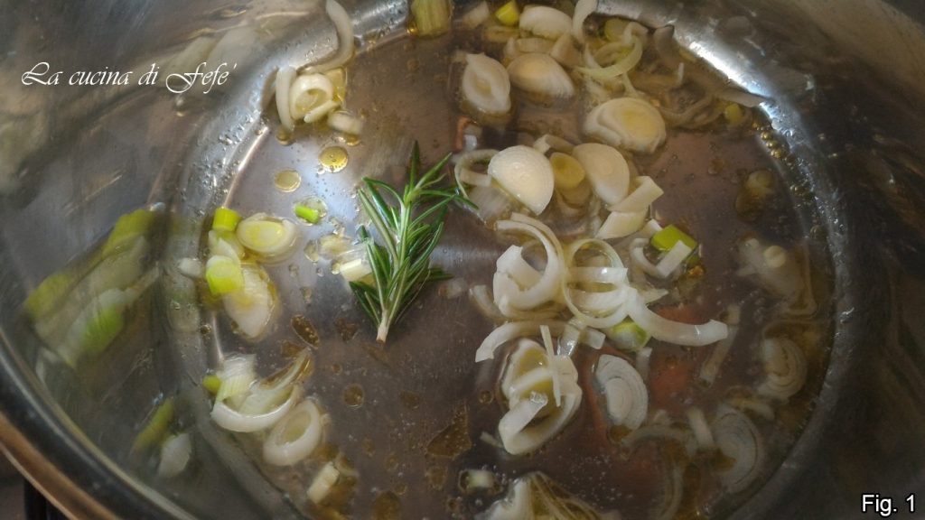 Lava el apio y pica finamente a cuchillo los tallos y el corazón. Mientras tanto, en una cazuela grande, dora con un chorrito de aceite, el cebollino cortado en rodajas y una ramita de romero.