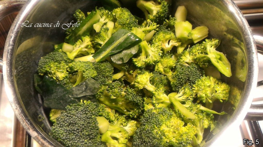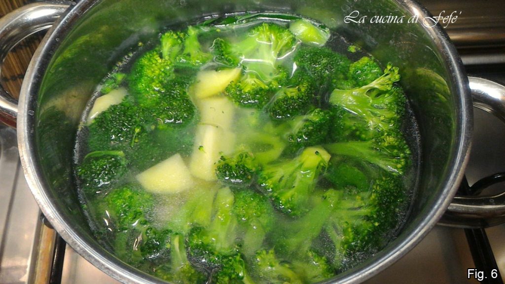 En este punto, cubrid las verduras con el caldo caliente. Llevad a ebullición, luego bajad el fuego y, cubriendo con una tapa, dejad cocinar durante aproximadamente 25′ o hasta que las patatas y los brócolis estén tiernos (fig. 6).