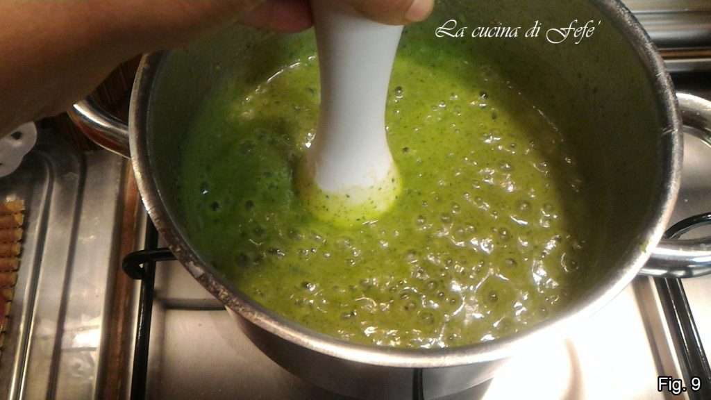 Una vez que la sopa de brócoli esté tibia, eliminad el exceso de caldo, luego pasadla con la batidora de mano hasta obtener una crema lisa y homogénea (fig. 9).