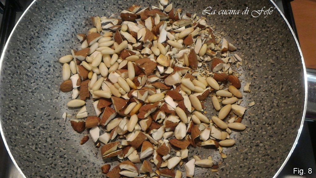 Dejad templar. Mientras tanto, picad las almendras y los piñones de manera gruesa, luego tostádlos durante unos minutos, girándolos continuamente en una sartén antiadherente (fig. 8).