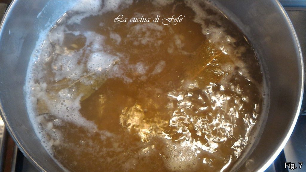 Lava la avena bajo agua corriente con la ayuda de un colador de malla fina, luego cocínala en una cacerola grande con abundante agua salada y 2 hojas de laurel durante unos 45′. Apaga y escurre bien (fig. 7).