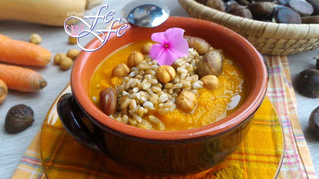 ¿Estáis de acuerdo conmigo en que noviembre como enero deberían ser dos meses dedicados a platos sanos antes y después de las grandes comilonas de Navidad? Yo, después del verano, he vuelto a cocinar sano, lo que no me ha disgustado en absoluto, ya que mi organismo había comenzado a mostrar los primeros signos de malestar. Pero os confieso, y creo que ya lo habéis entendido, que estos platos genuinos, humeantes y reconfortantes me gustan independientemente!!! Así que tendréis que soportar una serie de recetas fit y detox, que luego son solo en parte, si tenéis en cuenta todos los ingredientes empleados. Además, para quienes son amantes como yo de las cremas, espero que sean una inspiración más para variar de las tristes recetas habituales de verduras hervidas. La que hoy os propongo, ha sido un éxito increíble, no solo porque se trata de un plato completo desde el punto de vista nutricional, sino porque también creo que el sabor dulce de la calabaza y las zanahorias se combina bien con la consistencia de la avena integral y el sabor marcadamente rústico de las avellanas tostadas. Y dado que estamos en otoño, además de las avellanas, también he añadido trocitos de castañas cocidas al vapor. Como muchos de vosotros sabrán, las castañas siempre se han considerado el «pan de los pobres» y esto dice mucho sobre los macronutrientes que estos frutos garantizan a nuestro organismo. Claro, los frutos secos son muy calóricos, ¡pero compensan perfectamente todo lo demás! Así que un plato equilibrado, sano y sabroso que no os dejará decepcionados!