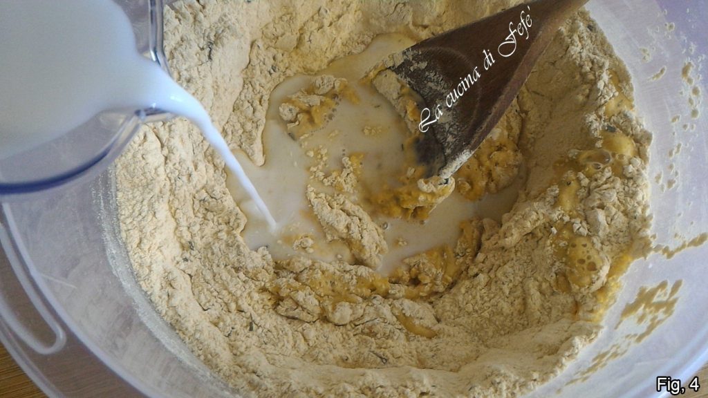 Añadir el aceite y verter la leche en hilo, continuando a mezclar primero con la cuchara de madera y luego con un batidor de mano (fig. 4).