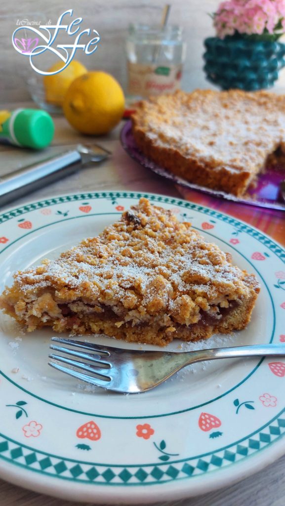 • Añadid luego la masa restante desmenuzándola con las manos hasta cubrir toda la superficie de la tarta y hornead en horno precalentado y estático a 175 °C durante 40′-45′.