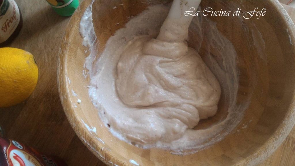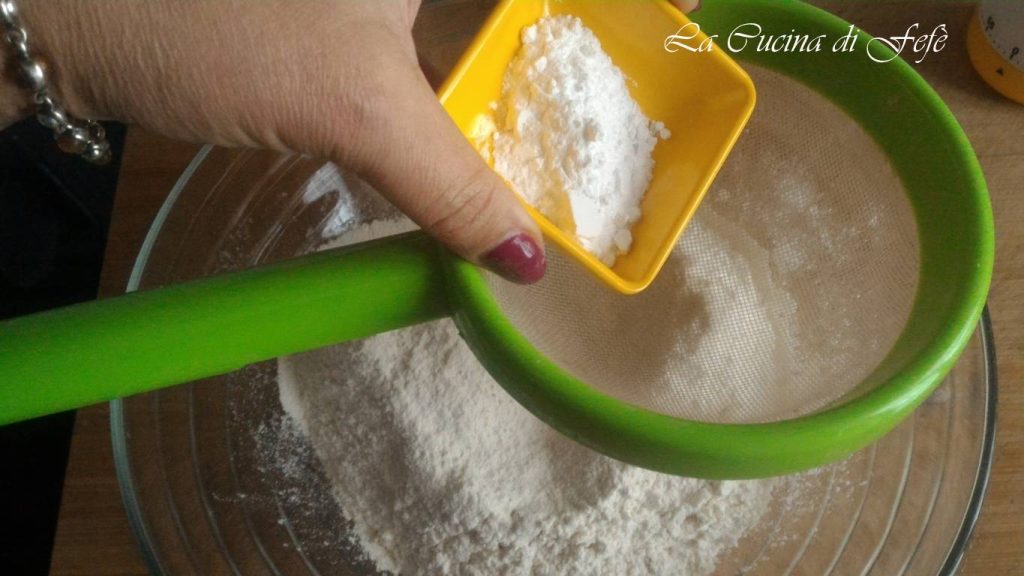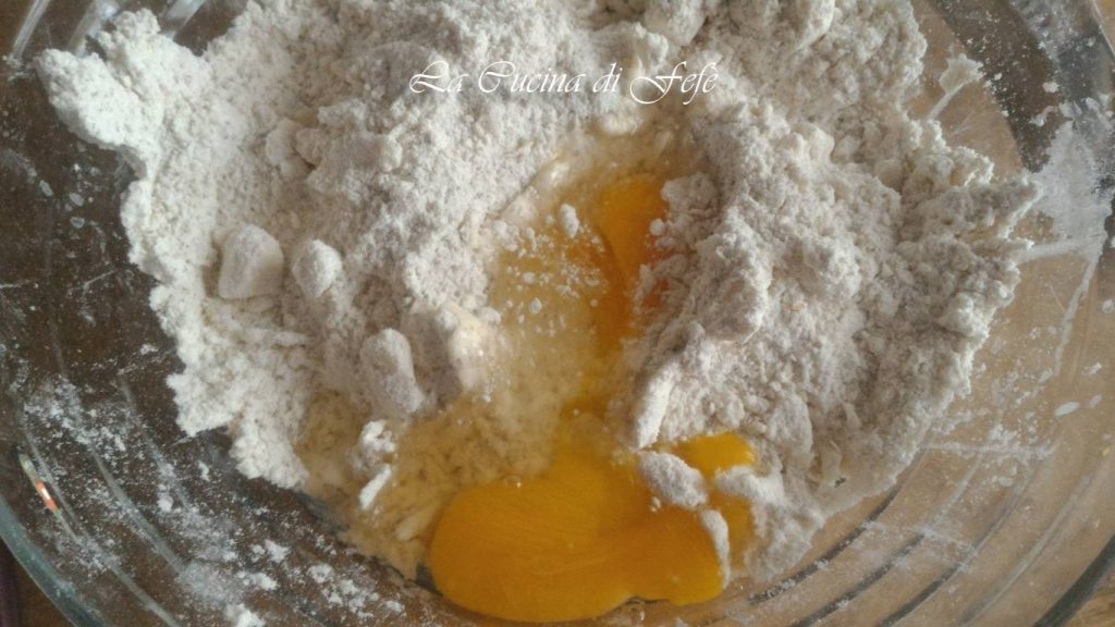 • Añadid también el azúcar y trabajad de nuevo a mano hasta que todos los ingredientes estén absorbidos. Debéis obtener una mezcla gruesa, que dejaréis reposar 15′ a temperatura ambiente, cubriendo con un plato o film transparente.